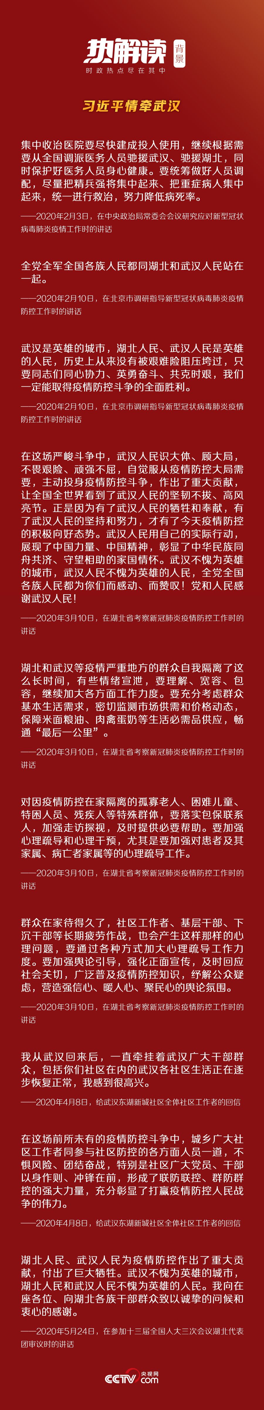 习近平在审议现场鼓励湖北和武汉人民:“现在湖北各方面工作任务很重,困难很多。要发扬在疫情防控斗争中展现的精神面貌,真抓实干,敢于负责、敢于斗争、敢于克服困难,去取得新的更大的胜利。湖北、武汉,一定能够浴火重生。”