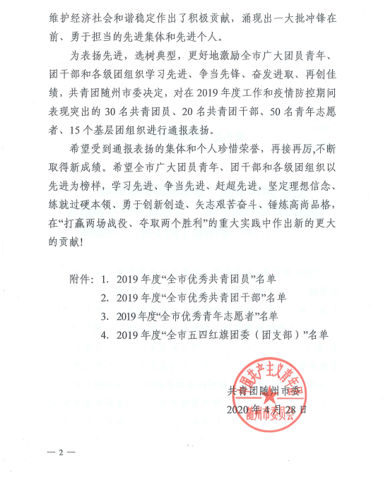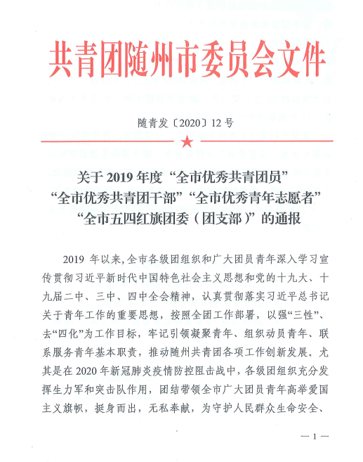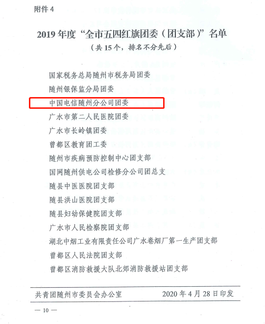 在共青团随州市委2019年度“全市优秀共青团员”“优秀共青团干部”“优秀青年志愿者”“五四红旗团委团支部”的通报中,随州电信分公司团委荣获“五四红旗团委”称号。