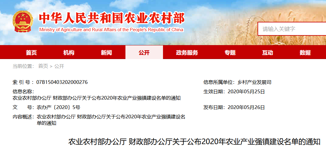 公布了2020年农业产业强镇建设名单