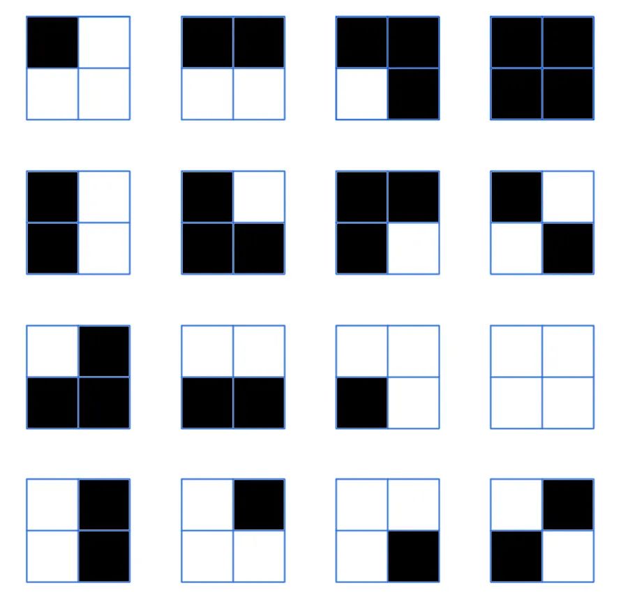 下面四宫格,每个格子有两种颜色变化,请问一个四宫格可以组合出多少个图形?