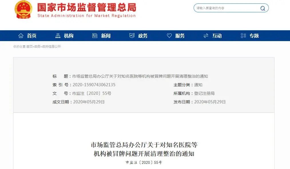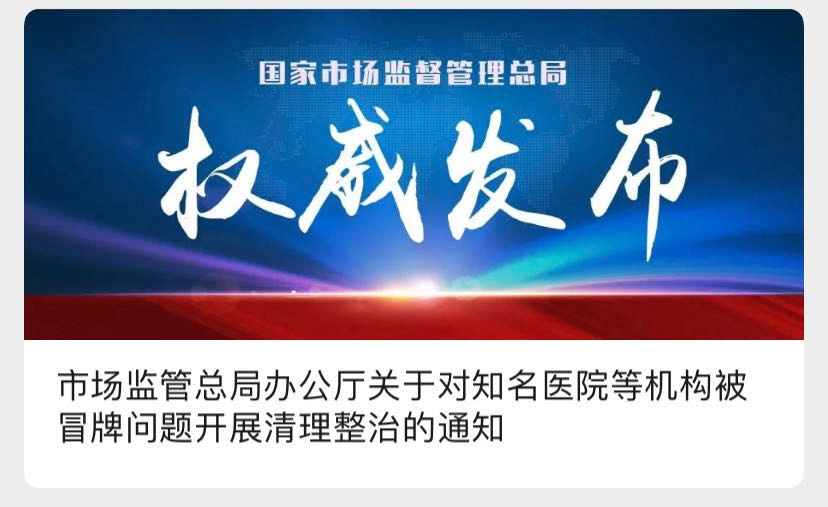 近日,市场监管总局办公厅发布关于对知名医院等机构被冒牌问题开展清理整治的通知(以下简称通知)。通知指出,将对知名医院等机构被冒牌问题在全国范围内开展清理整治。