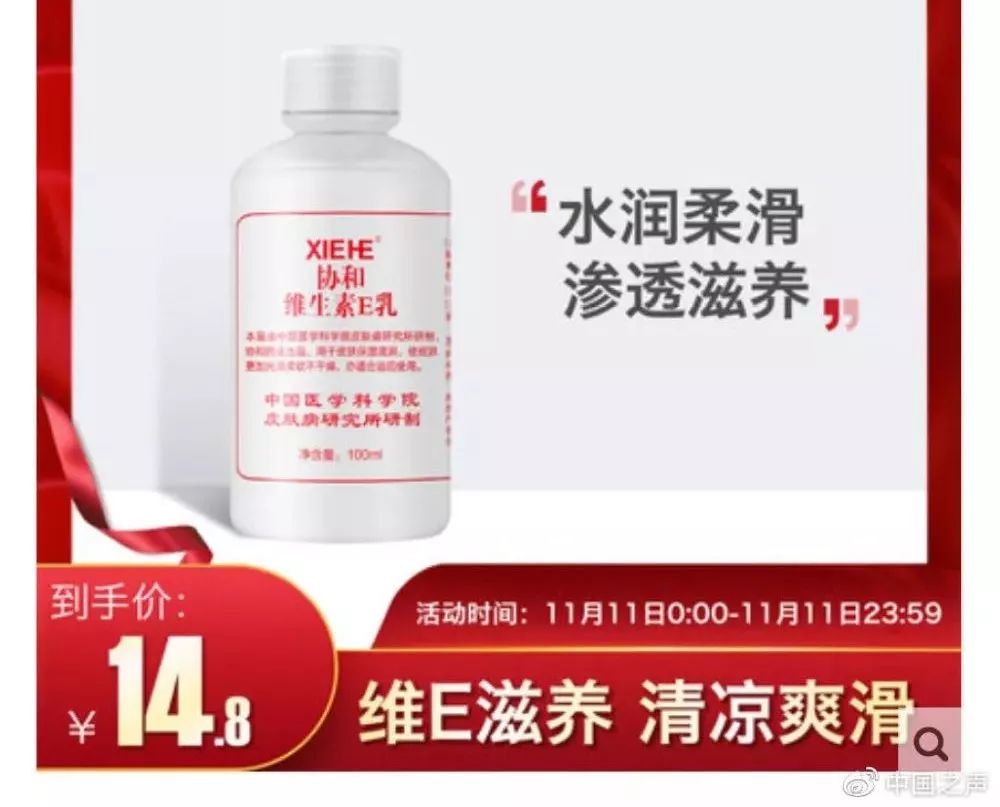这款护肤品叫做“协和维E乳”。当时,在某电商平台的“协和旗舰店”店铺中,100毫升装的“协和维E乳”每瓶只卖14块6;最关键的是,这个名叫“协和”且发货地标注为北京的店铺,很难不让消费者把它跟著名的北京协和医院联系在一起。