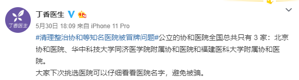 得知这一消息,@丁香医生 发文提醒,公立的协和医院全国总共只有 3 家:北京协和医院、华中科技大学同济医学院附属协和医院和福建医科大学附属协和医院。
