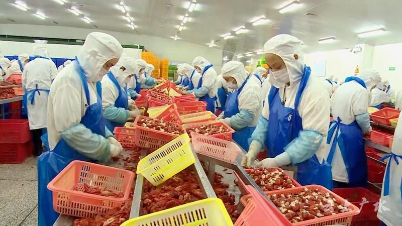 身穿工作服的生产部经理高艳霞每天穿梭在宽阔的车间里。她的四周是600多名手拿镊子、动作娴熟的剥虾工人。被煮熟的鲜红色小龙虾在她们戴着胶皮手套的指尖翻飞跳跃——掐头、去壳、抽虾线、清洗,不到五秒钟,一颗完整的虾仁就被剥好,落入成排的铝制小碗。