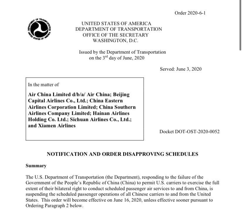 当地时间3日,美国交通部正式宣布,因中方没有允许美国航空公司提供往来中国的服务,美方将暂停允许中国航空公司提供来往于美国的航班,相关规定从当地时间6月16日开始执行,但仍有可能提前。