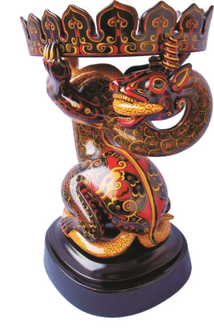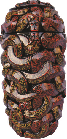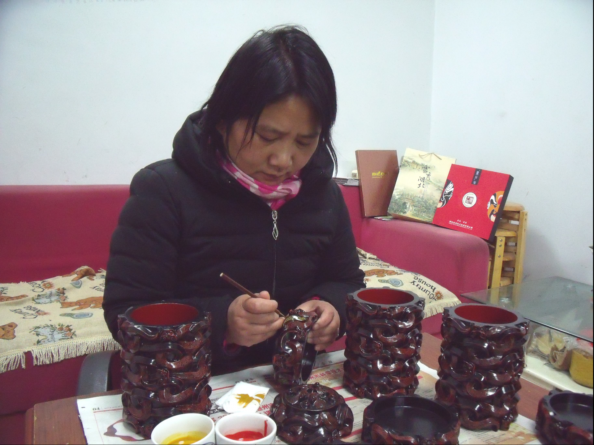 曾国漆器髹饰工艺品制作主要环节包括:研究(筛选)—设计构图—制坯体—粗雕轮廓—精雕—打磨—上灰打磨数道—封底—上底漆、上面漆数道—水磨—上亮油—彩绘—推光—成品等几十道工序,主要涉及浮雕、透雕、圆雕、剜凿、阴刻并采用点描线勾、平涂色块、堆漆、针刻等技法。