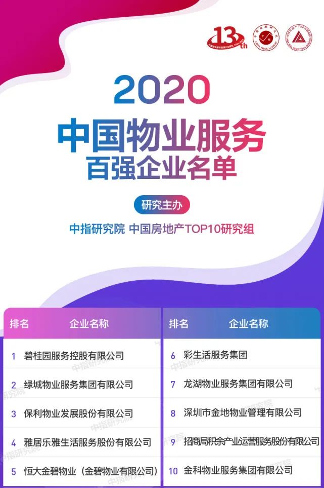 因为百强物业服务企业名单过长,这里就截取了前十的榜单。我们可以看到很多物业公司名称都非常的熟悉。
