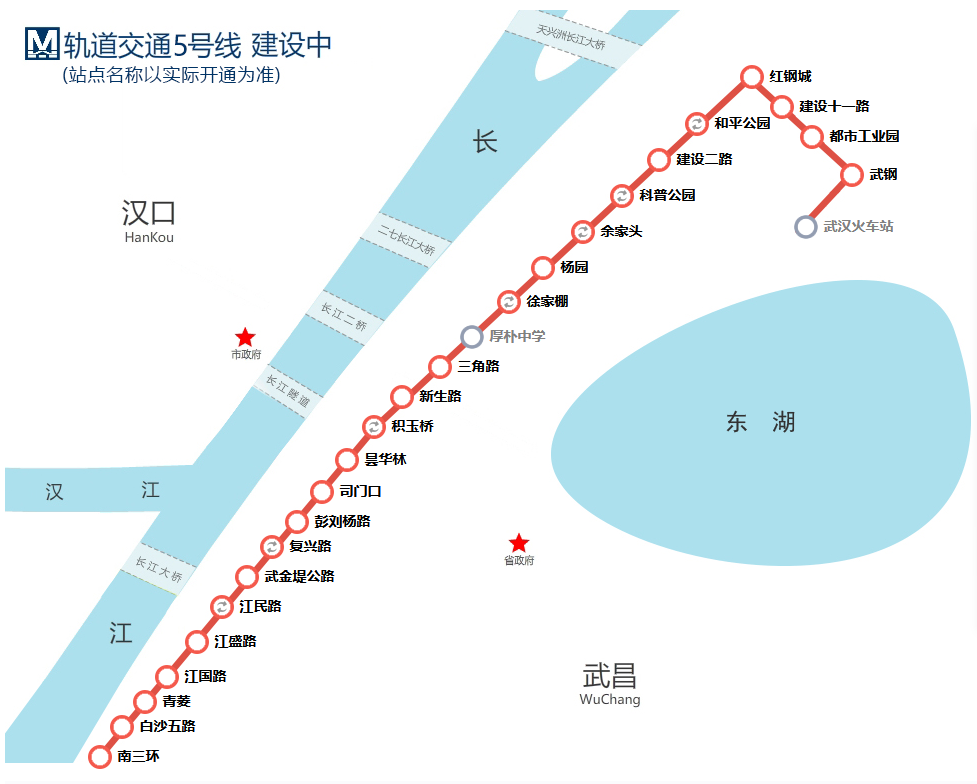 武汉地铁集团回复表示,5号线全线设站点25座,已全部开工建设,其中21座车站主体结构已完工,复兴路站、昙华林站等4座车站正在进行主体结构施工,区间隧道正同步地进行建设,计划2021年12月开通试运营,具体开通时间请以市政府公告为准。