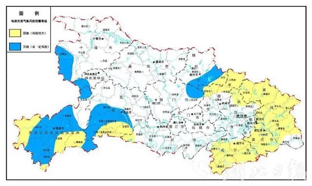 预计咸宁市,黄石市,黄冈市,恩施州城区东南部、建始县南部局部、利川市西部、咸丰县西部局部、宣恩县中部和东部、鹤峰县西部和中部、来凤县南部,五峰县中部和东部、长阳县东南部、宜都市,松滋市西部,广水市东部和南部,大悟县、安陆市、孝昌县北部,武汉市黄陂区北部、新洲区东北部,鄂州市鄂城区等地质灾害高易发区和部分中易发区受持续降水影响引发崩塌、滑坡、泥石流等突发性地质灾害的风险较大,为黄色预警。