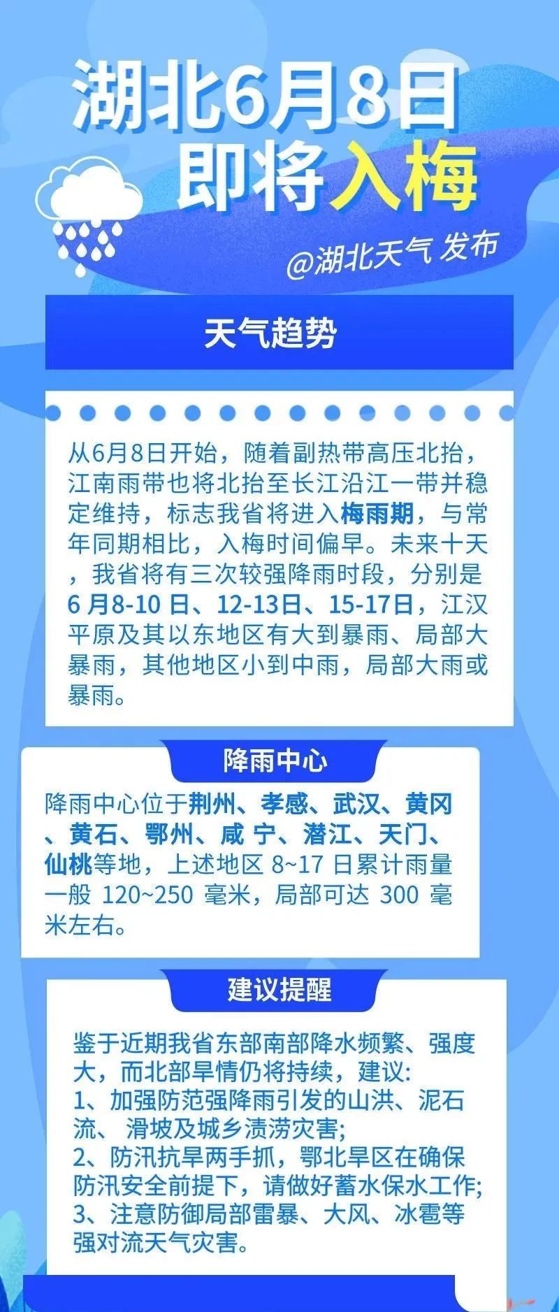 天气预报显示,预计未来十天,我省将有三次较强降雨时段,分别是:6月8日至10日、12日至13日、15日至17日。