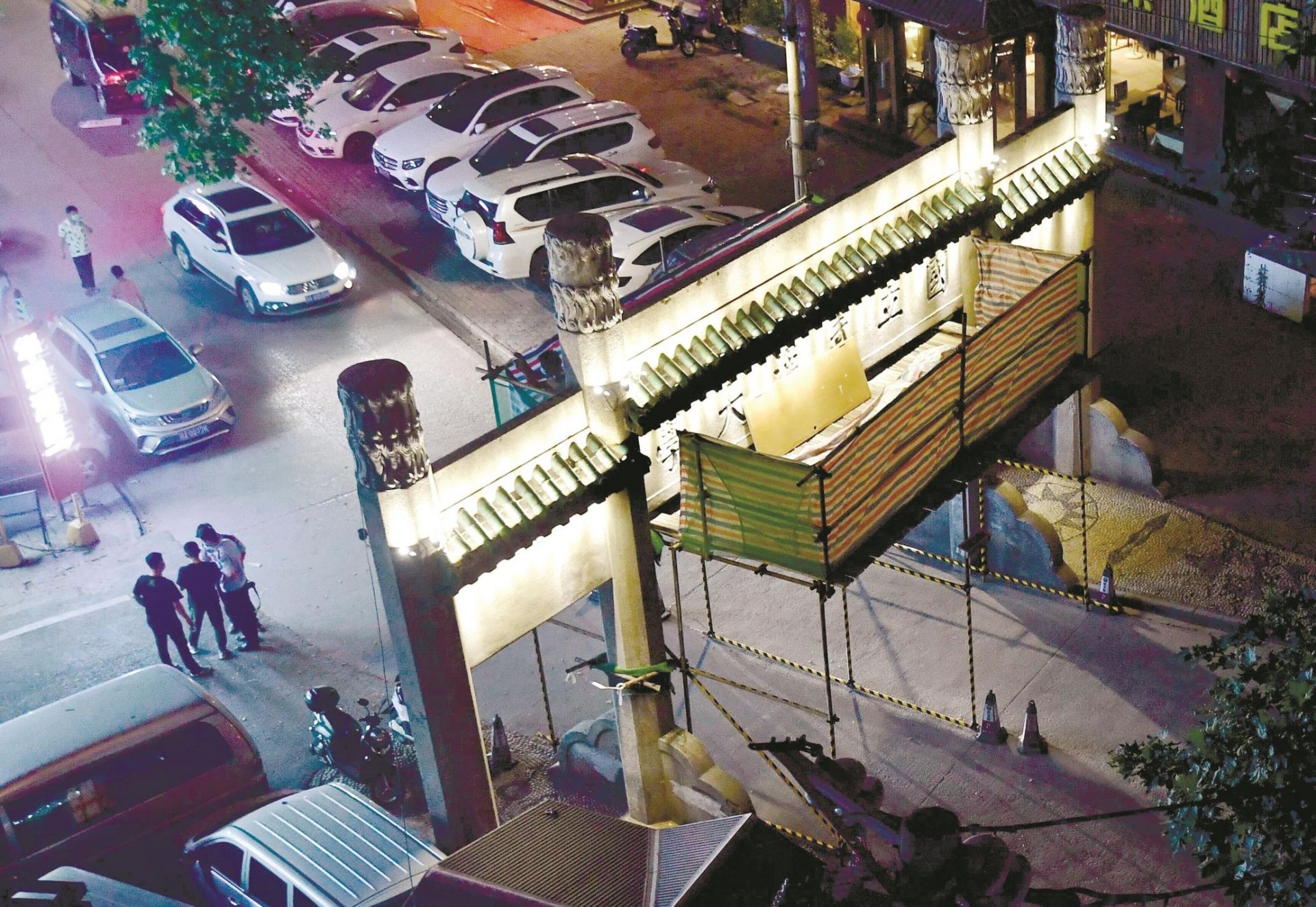 昨日下午3时许,楚天都市报记者来到珞珈山路,此时老牌坊周边已经搭起了脚手架,脚手架下沿还设立了一个3米的限高提示,受损处则被油布保护起来。负责脚手架搭建工作的工作人员称,搭建临时支护措施,既是为了确保文物本体安全,也是为了防止过往行人被砸伤。