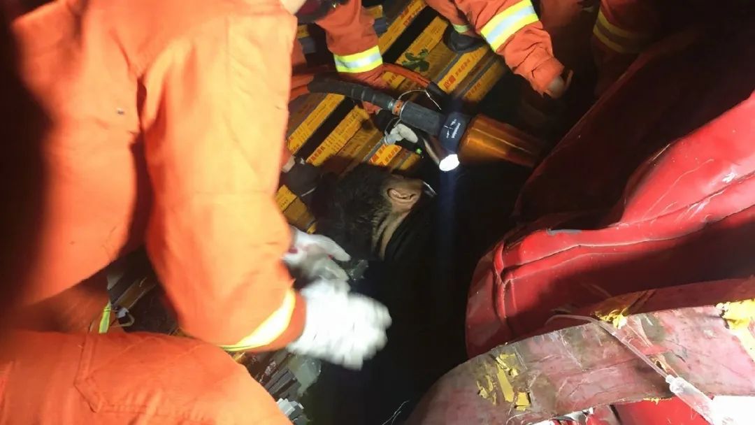 20时11分救援人员到达现场后发现,一辆满载铝材的货车冲出高速护栏后侧翻,驾驶室严重变形,一人被紧紧卡在车内副驾驶位置无法动弹,并不时发出呻吟声,车上装载的铝合金条散落在车头附近,导致救援空间极其狭窄,车内无漏油情况。