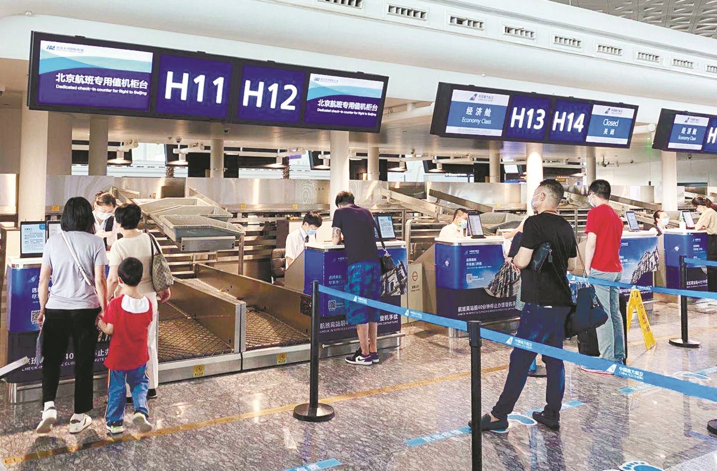 9日下午,武汉天河国际机场T3航站楼出发大厅里,航空公司为前往北京的旅客开辟了专用值机及安检通道。武汉进京人员持7日内核酸检测阴性证明,经体温测量、扫描健康绿码后便可办理相关乘机手续。