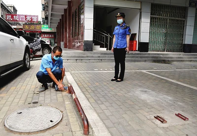 城管执法人员对擅自占用停车位私设地桩、地锁、石墩等违法行为,事先上门做工作,通知商家自行整改,责令在规定的时间内拆除。