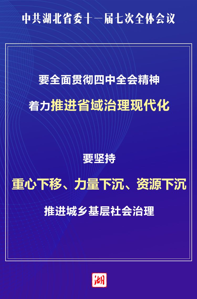 6月10日,湖北省委十一届七次全会举行,审议通过《中共湖北省委关于贯彻落实党的十九届四中全会精神、推进省域治理现代化的决定》,提出要全面贯彻四中全会精神,着力推进省域治理现代化。