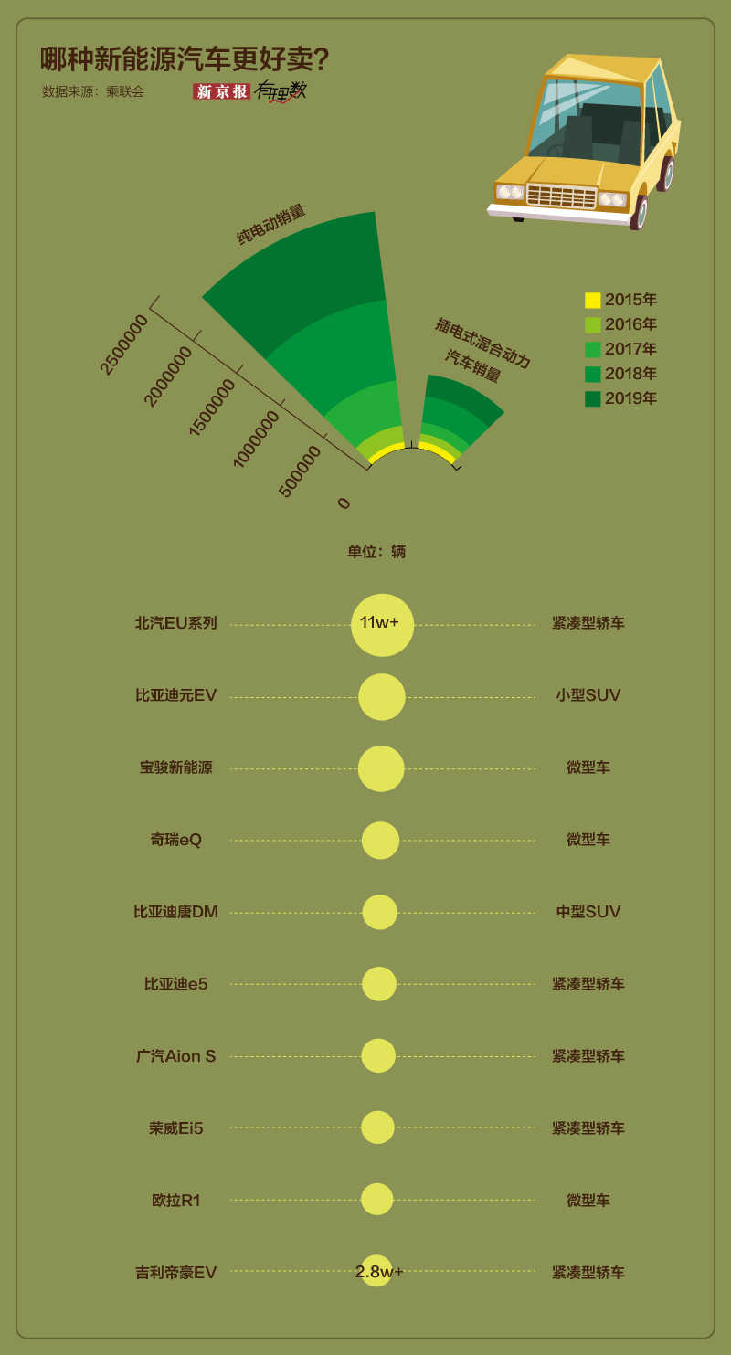 乘联会数据显示,2019年全国共售出100万余辆新能源乘用车,其中超过八成都属于纯电动车型,近年来插电式混合动力车型的销量占比一直在下滑。