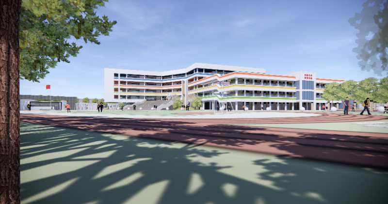 经改扩建后,蒋家岗学校校区增加占地面积12.92亩,新增建筑面积8237.82平方米,整体绿化面积约10000平方米。学校规模上整体扩大为24个教学班,新建的综合教学楼依据地形呈折形布局,整体造型舒缓大气,功能齐全。在与老教学楼之间的联系上,采用连廊进行逐层连接,使学生之间交流更为方便。对原有食堂、辅助用房、幼儿园、公共卫生间进行改造,并新增300米的标准跑道,以及足球场、篮球场、综合运动场等活动场地。