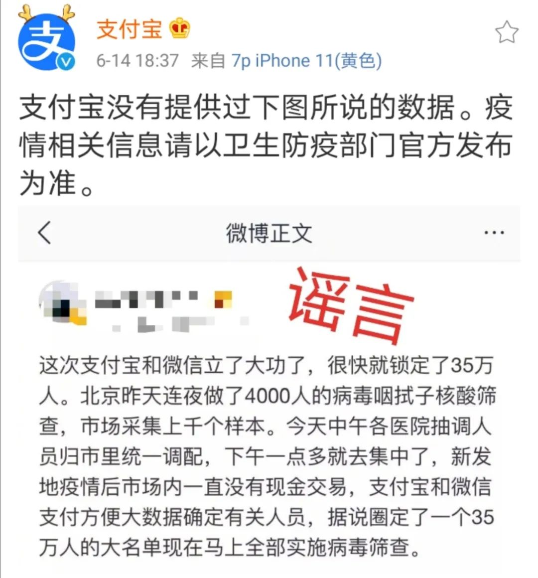 6月14日晚,@支付宝 官方微博发布辟谣信息:支付宝没有提供过下图所说的数据,疫情相关信息请以卫生防疫部门官方发布为准。
