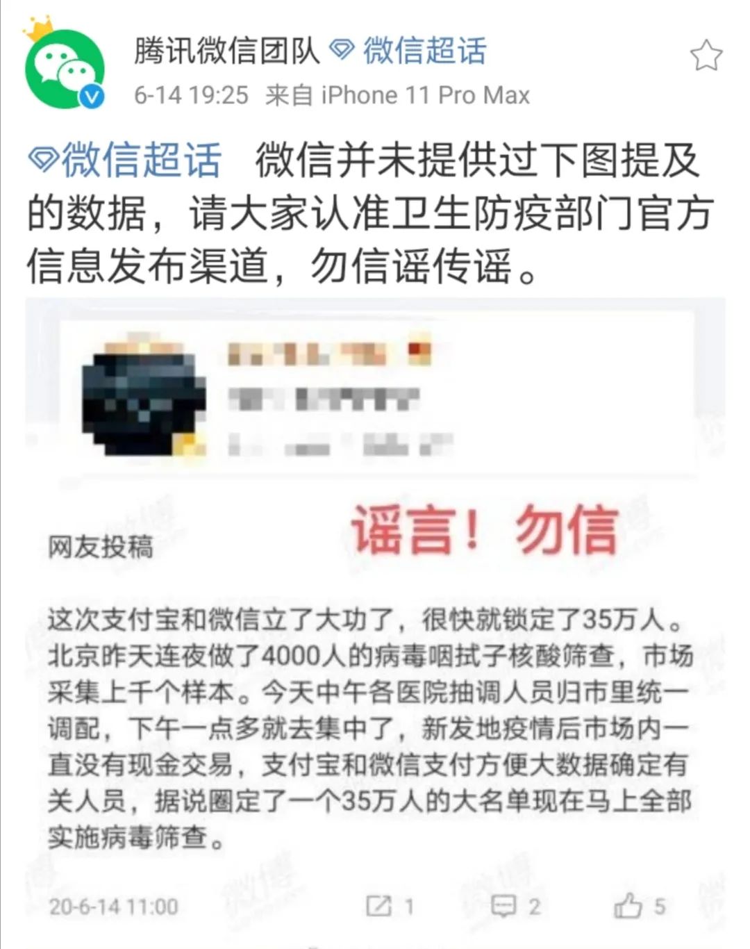 随后,@腾讯微信团队 官方微博也对此事进行了辟谣:微信并未提供过下图提及的数据,请大家认准卫生防疫部门官方信息发布渠道,勿信谣传谣。