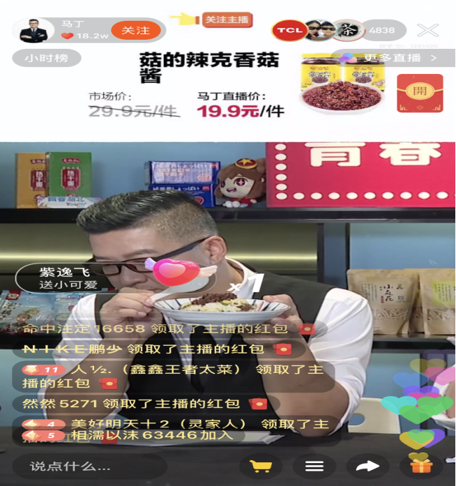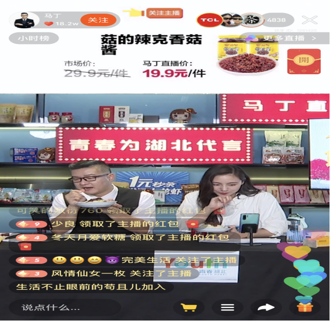 本次活动在快手直播平台进行,“青春湖北”微信、微博、抖音、斗鱼、头条、1点资讯、百家号等平台同步宣发,青春扶贫大使王祖蓝、马丁夫妇、林永健、TCL实业控股CEO王成连麦助力。现场,主播马丁热情地讲述香菇知识,为随州品源菇的辣克香菇酱等优质农产品做推介,优质的产品和相对低廉的价格吸引了不少粉丝关注,整场直播最高观看人数达到50万人,众多粉丝在线抢购,为随州香菇线上线下销售进一步拓展了营销渠道。
