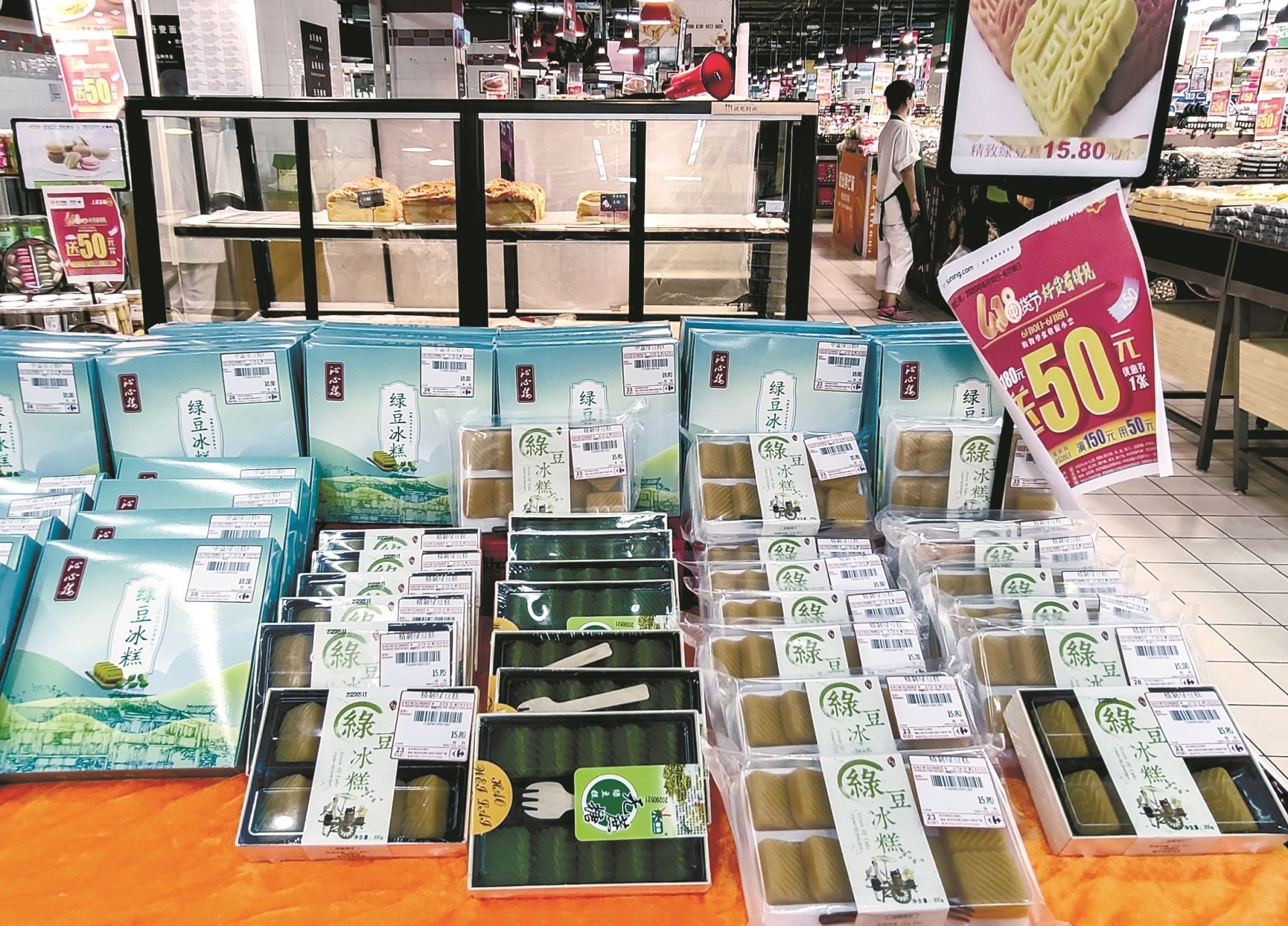 因为已经临近端午节,在售的老字号绿豆糕都做起了促销活动,一盒糕点多在20元上下,有的还能买一盒绿豆糕送一盒芝麻糕,或者搭配着买可以享受打折优惠。“前几天买了两包吃,味道也还比较清爽,不是很甜腻。”市民罗女士说着又将老式绿豆糕和新式绿豆冰糕各拿了一盒。