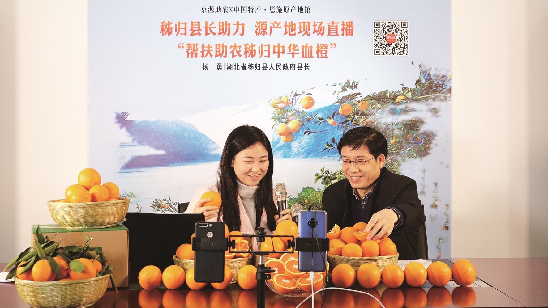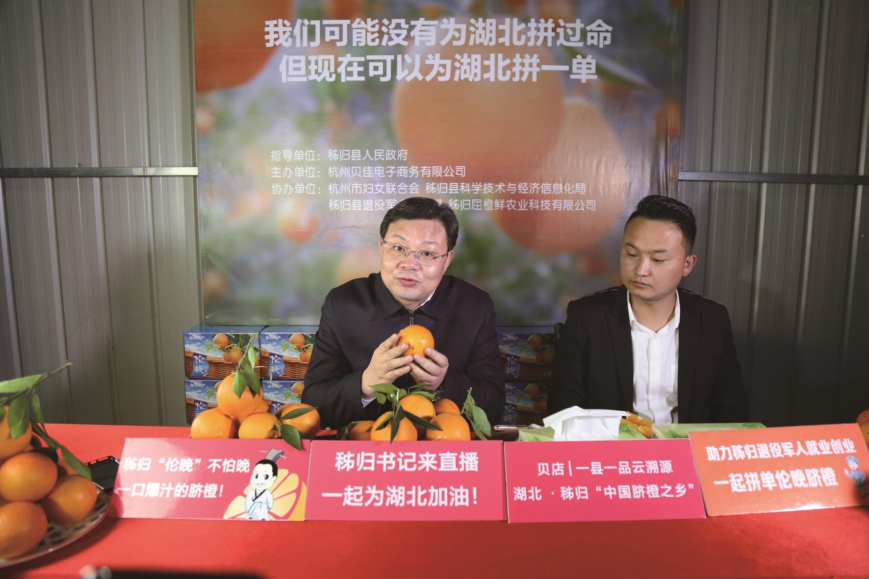秭归县委书记卢辉(左一)直播带货,助力脐橙销售。