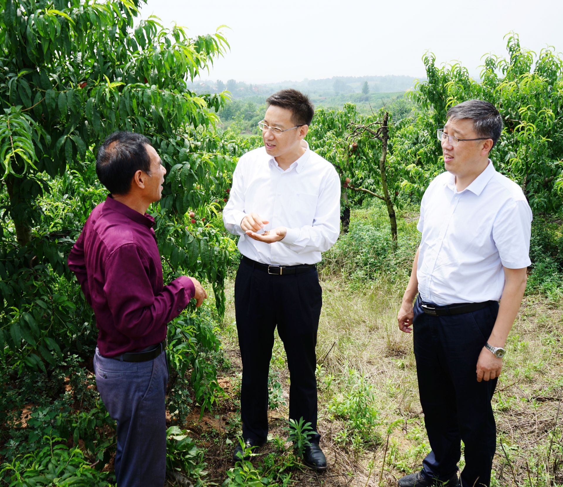 近年来,澴潭镇刘庙村因地制宜发展油茶、水果等产业,带领贫困户脱贫致富。克克先后来到该村油茶基地和白桃、红桃、西瓜种植基地,实地查看基地规划建设情况,详细了解油茶、水果种植基地的经济效益和发展前景。慧勤公司在澴潭镇刘庙村、大碑店村种植油茶1.1万余亩,常年带动两村贫困户70余人在公司务工,人均年可增收5000元以上。在刘庙村油茶基地,克克与基地负责人和当地干部深入交流,详细了解基地建设发展情况,重点询问产业带贫成效,鼓励基地负责人不断发展壮大规模,履行社会责任,为脱贫攻坚作出贡献。刘庙村组建了水果专业合作社,采取“村集体+村干部+大户+贫困户”的股份合作模式,现有桃树基地近1500亩,套种西瓜500亩、紫薯100亩、花生100亩。克克认真查看了桃树长势,详细了解了套种栽植、管护模式及水果产量、销售等情况。