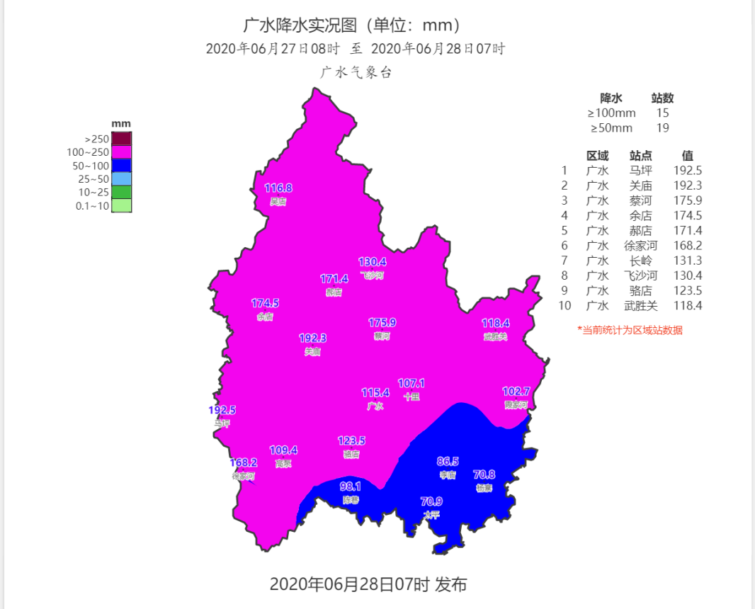 6月27日下午到夜间,广水市东南部暴雨,其余大部地区大暴雨。27日08时-28日07时,广水国家观测站115.4毫米,应山城区118毫米;超过150毫米以上的乡镇有五个,分别是马坪192.5毫米、关庙192.3毫米、蔡河175.9毫米、余店174.5毫米、郝店171.4毫米。