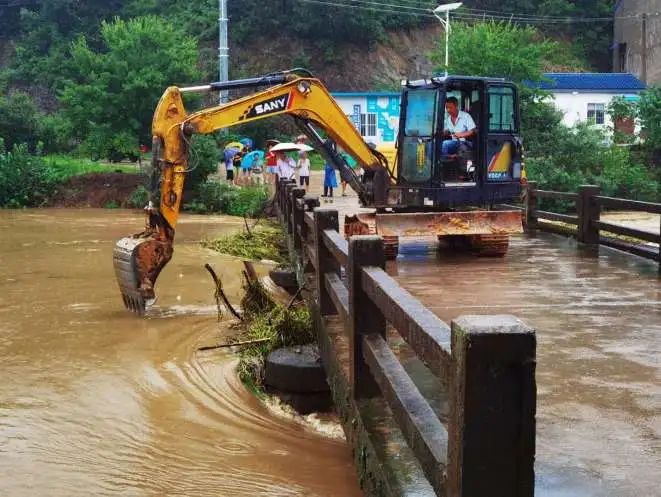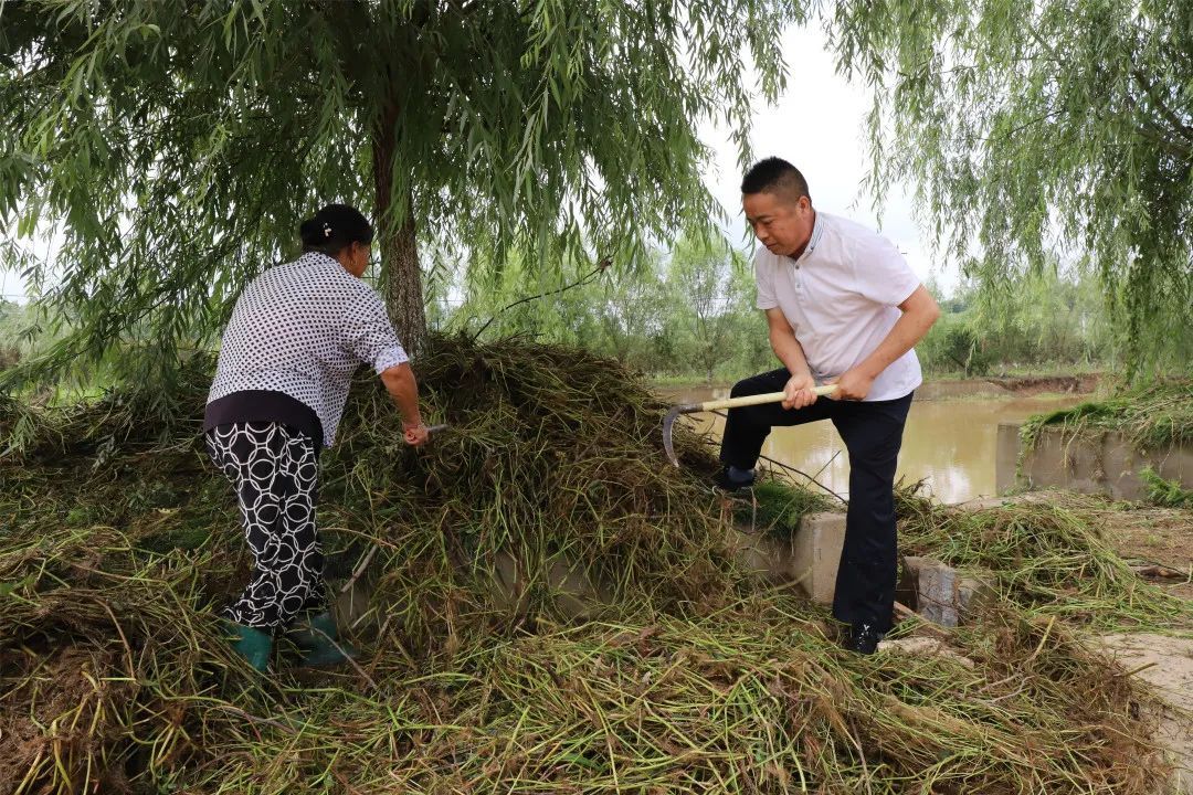 正在同村民一道铡草的王店村党支部书记李洪斌,停下手中的镰刀,用手擦了下额头上的汗珠。“昨天涨水,前面泄洪道被冲下来的杂草和漂浮物堵塞住了。雨势变小以后,我们调来大型机械紧急清杂排险。这些杂草、树根、淤泥和石块有的是机械挖上来的,有的是洪水冲刷下来的。我们发动了50多民村民,自带工具,三河口段近3公里的公路已经全线畅通。”李洪斌说。