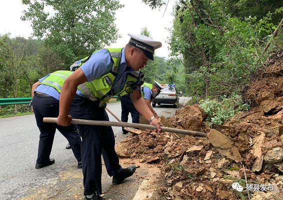 6月29日上午,交警大队加强暴雨后期路面巡查和隐患排查整治力度,巡查发现多处山体滑坡滚石占道险情后,及时组织清理,消除道路交通安全隐患。(戴玉平)