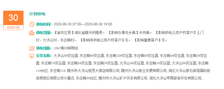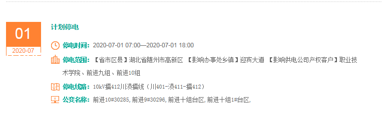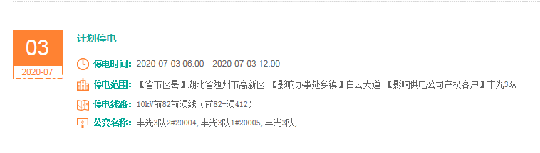 停电范围:【省市区县】湖北省随州市高新区 【影响办事处乡镇】白云大道 【影响供电公司产权客户】丰光3队