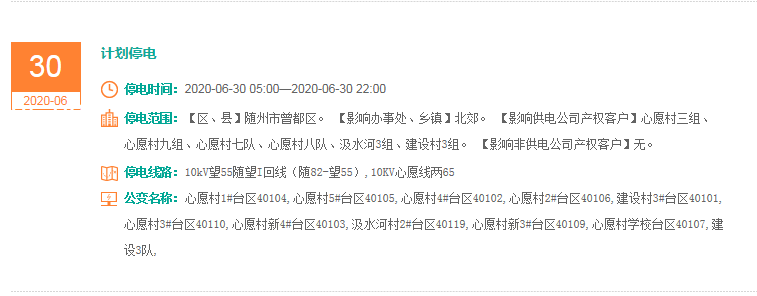 停电范围:【区、县】随州市曾都区。【影响办事处、乡镇】北郊。【影响供电公司产权客户】心愿村三组、心愿村九组、心愿村七队、心愿村八队、汲水河3组、建设村3组。