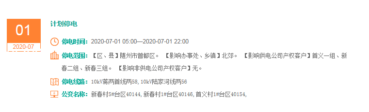 停电范围:【区、县】随州市曾都区。【影响办事处、乡镇】北郊。【影响供电公司产权客户】首义一组、新春二组、新春三组。