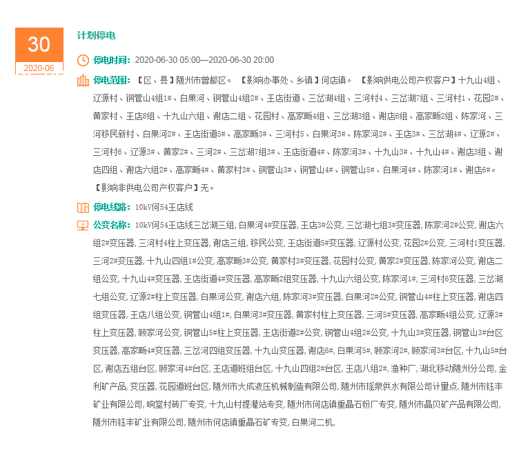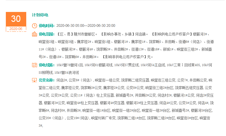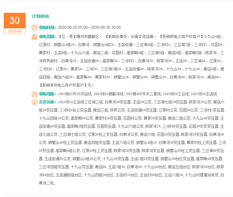 停电范围:【区、县】随州市曾都区。【影响办事处、乡镇】何店镇。【影响供电公司产权客户】十九山4组、辽源村、铜管山4组1#、白果河、铜管山4组2#、王店街道、三岔湖4组、三河村4、三岔湖7组、三河村1、花园2#、黄家村、王店8组、十九山六组、谢店二组、花园村、高家畈4组、三岔湖3组、谢店6组、高家畈2组、陈家河、三河移民新村、白果河2#、王店街道5#、高家畈3#、三河村5、白果河3#、陈家河2#、王店3#、三岔湖4#、辽源2#、三河村6、辽源3#、黄家2#、三河2#、三岔湖7组3#、王店街道4#、陈家河3#、十九山3#、十九山4#、谢店3组、谢店四组、谢店六组2#、高家畈4#、黄家村3#、铜管山3#、铜管山4#、铜管山5#、白果河4#、陈家河1#、谢店6#。