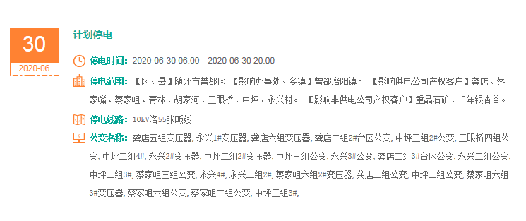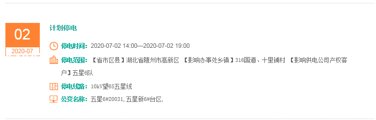 停电范围:【省市区县】湖北省随州市高新区 【影响办事处乡镇】316国道、十里铺村 【影响供电公司产权客户】五星6队