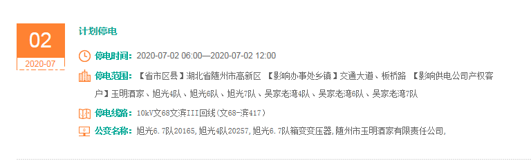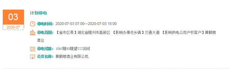 停电范围:【省市区县】湖北省随州市高新区 【影响办事处乡镇】交通大道 【影响供电公司产权客户】黄鹤楼酒业