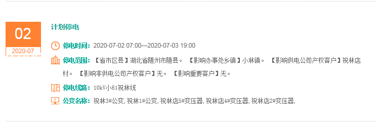 停电范围:【省市区县】湖北省随州市随县。【影响办事处乡镇】小林镇。【影响供电公司产权客户】祝林店村。