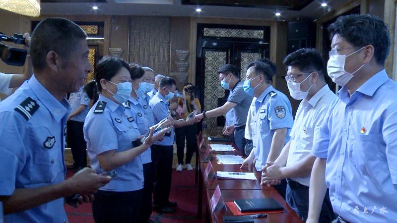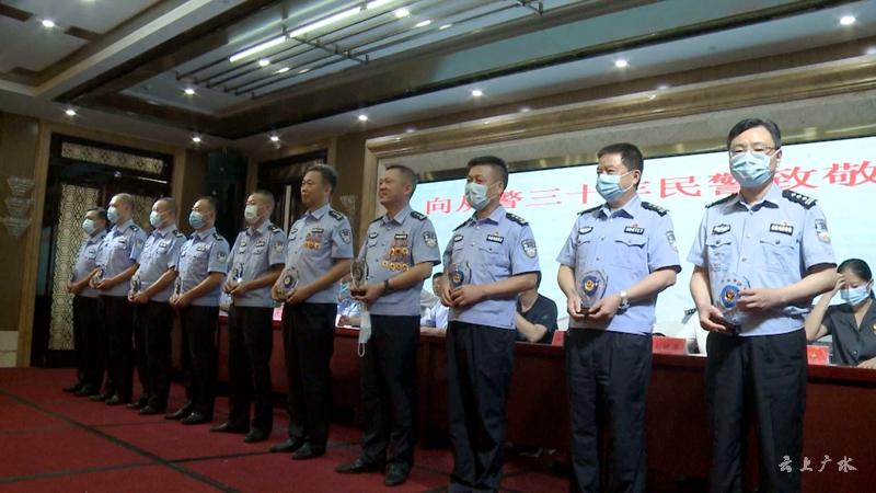 为传递使命,强化担当,见证广水公安精神的传承与发扬,共同庆祝中国共产党建党99周年,7月1号上午,广水市公安局人民警察退休和从警三十年荣誉仪式在中懋大酒店举行,7名退休和从警三十年的161名民警获荣誉牌。随州市公安局副局长杨学忠、广水市委书记黄继军、市长田涛、市政协主席陈延涛、市人大常委会主任石守超、市委副书记刘秀玲等四大家领导、法检司相关负责人出席荣誉仪式,并为7名退休和从警三十年的161名民警颁发了荣誉牌。