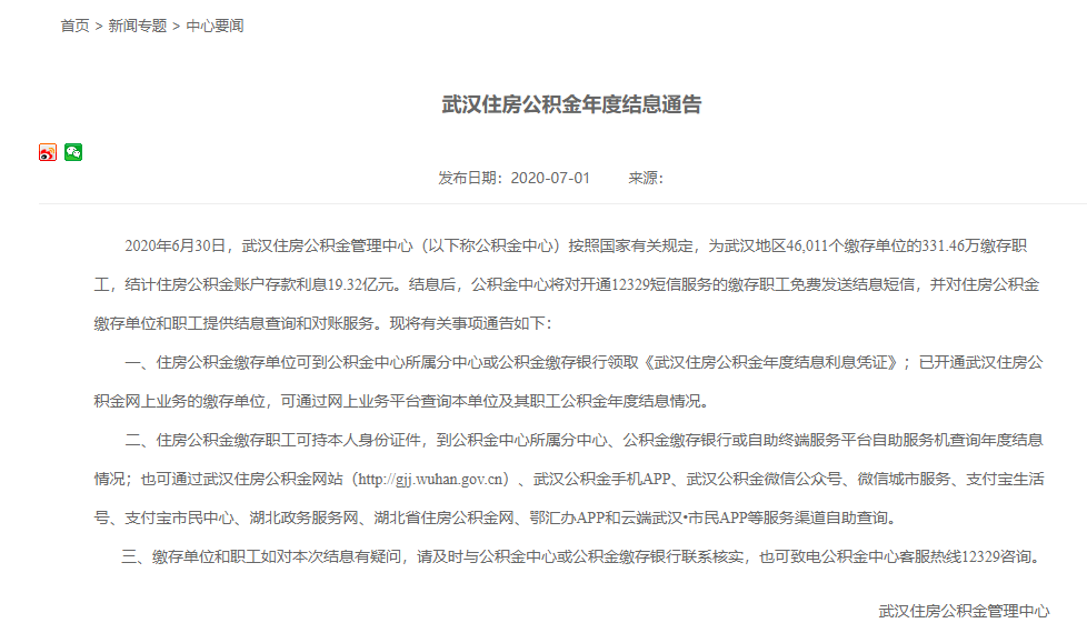 武汉住房公积金年度结息通告
