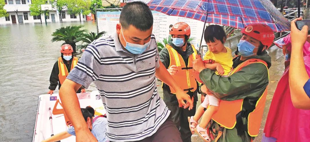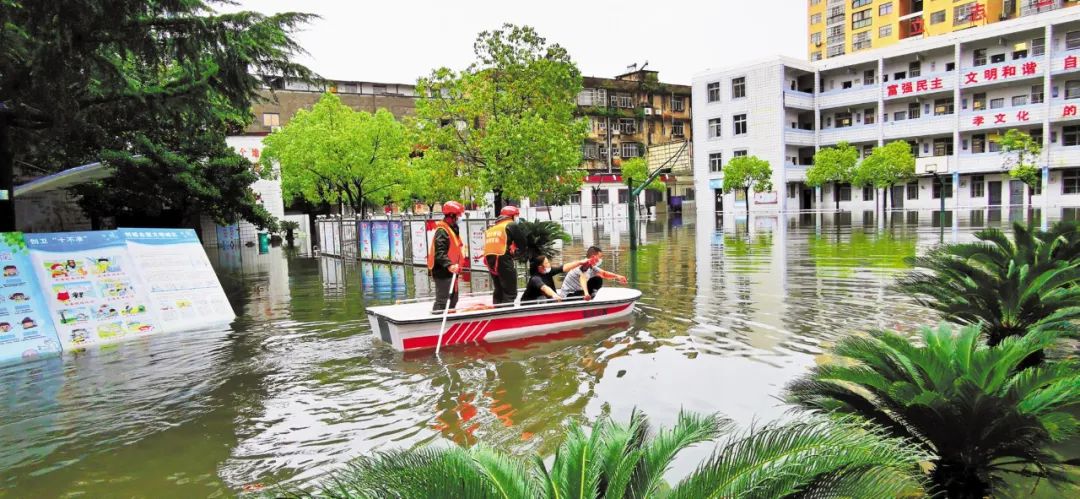 7月4日,黄冈市突遭暴雨袭击,黄州区西湖二路考棚小学院内的职工宿舍积水严重,部分低楼层群众被困家中。黄冈城管和消防救援大队派出人员及时赶到现场营救,在疾风骤雨中解救转移30余名被困群众。
