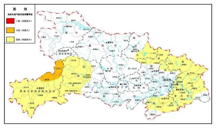 2020年7月4日20时-7月5日20时,预计三峡库区、恩施地区、黄冈地区、鄂州市、黄石地区,宜昌(宜昌市城区、远安西部、长阳、五峰)、随州(曾都区、广水)、孝感(安陆、孝昌、大悟)、武汉(黄陂北部、新洲东北部)、咸宁(咸安区、嘉鱼南部、赤壁、崇阳、通山)以及其他暴雨中心发生崩塌、滑坡、泥石流的风险较大(Ⅲ级),请相关地方政府及有关部门做好地质灾害防范工作;其中,三峡库区(巴东北部)、恩施(建始北部)发生崩塌、滑坡、泥石流的风险大(Ⅱ级),请相关地方政府及有关部门加强地质灾害防范,做好应急准备工作。