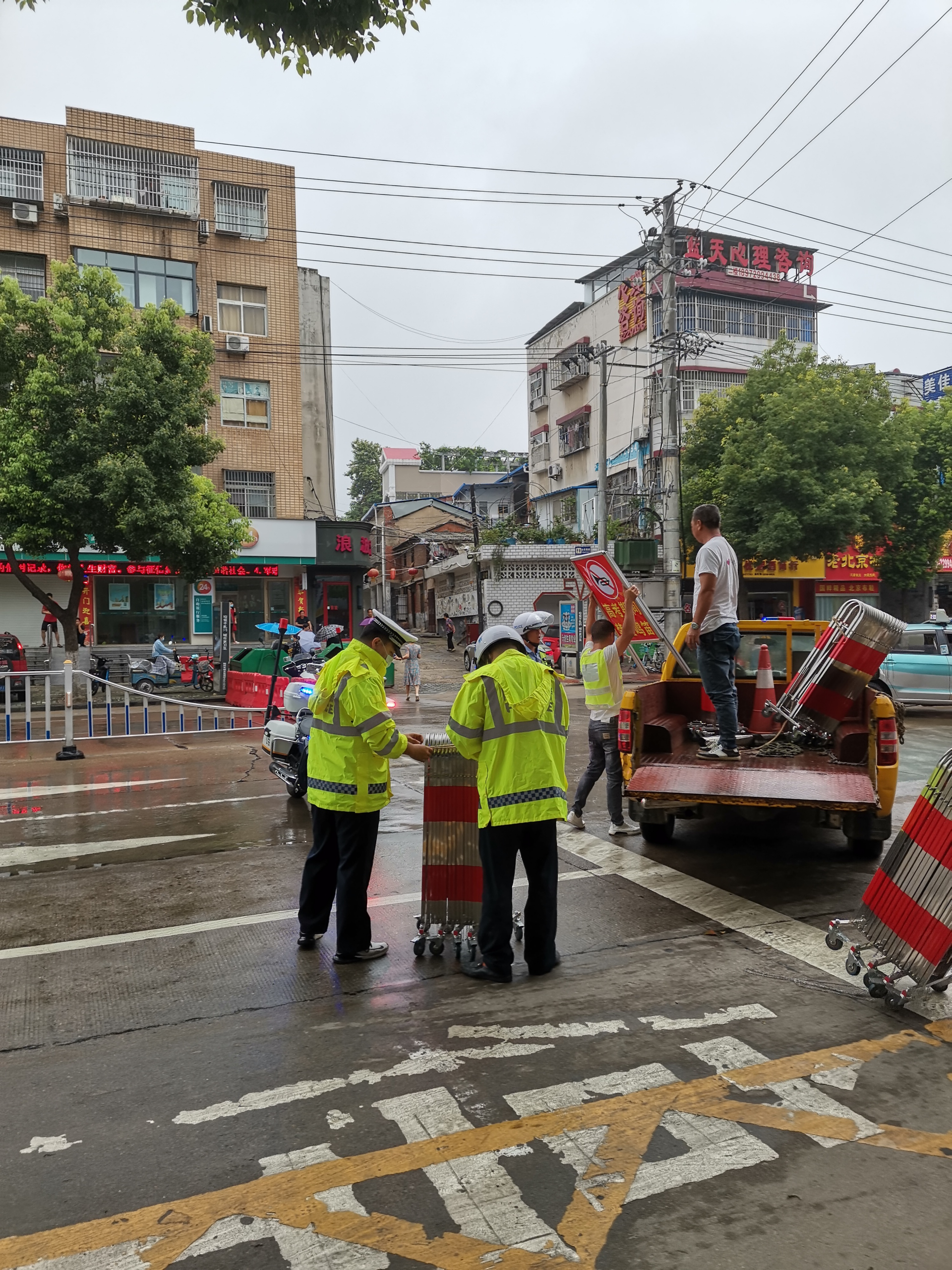 交警和武警就到达考场附近执勤点,