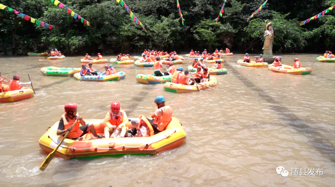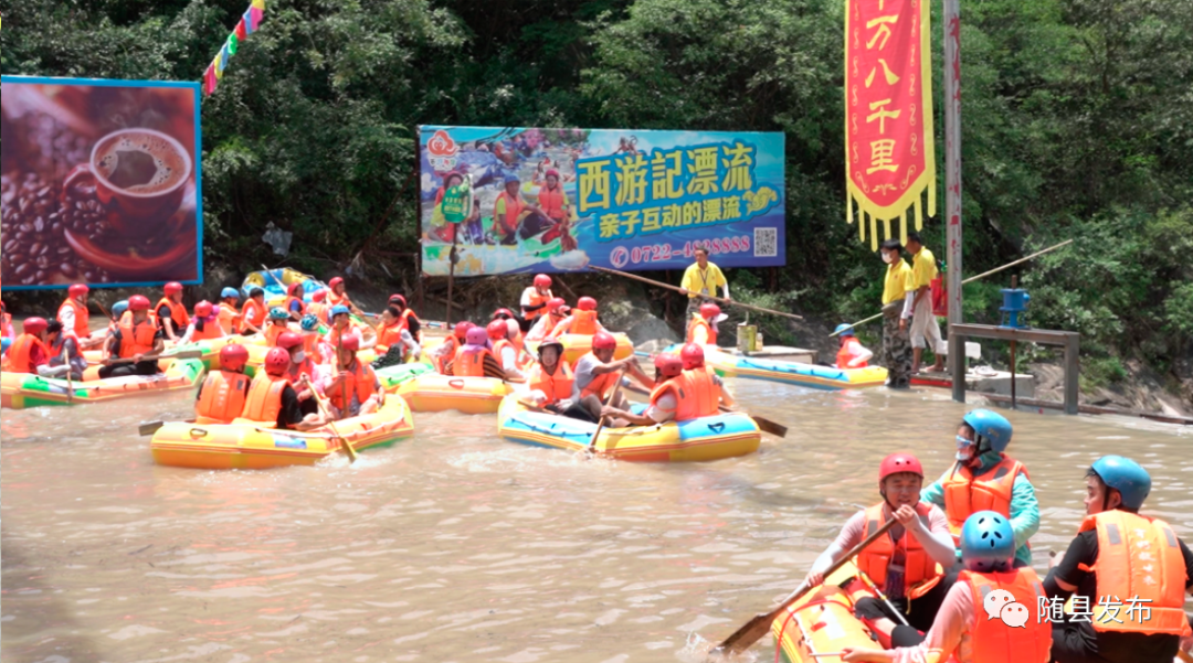 西游记漂流位于随县淮河镇龙泉村,是国家4A级景区。该景区拥有全程9公里的生态峡谷漂流河道,110米的首尾落差,9个S型的回旋弯道,30多处激流险滩,漂流时长达2个多小时。整个漂流段基础设施完备,在起点处、半程处、终点处均设有游客接待服务中心,日承载量可达20000人次。2020年,景区提档升级将河道进行了改建,由原来的二人船改成四人船,漂流皮筏艇空间变大,小朋友也能跟着父母一起畅享漂流乐趣。