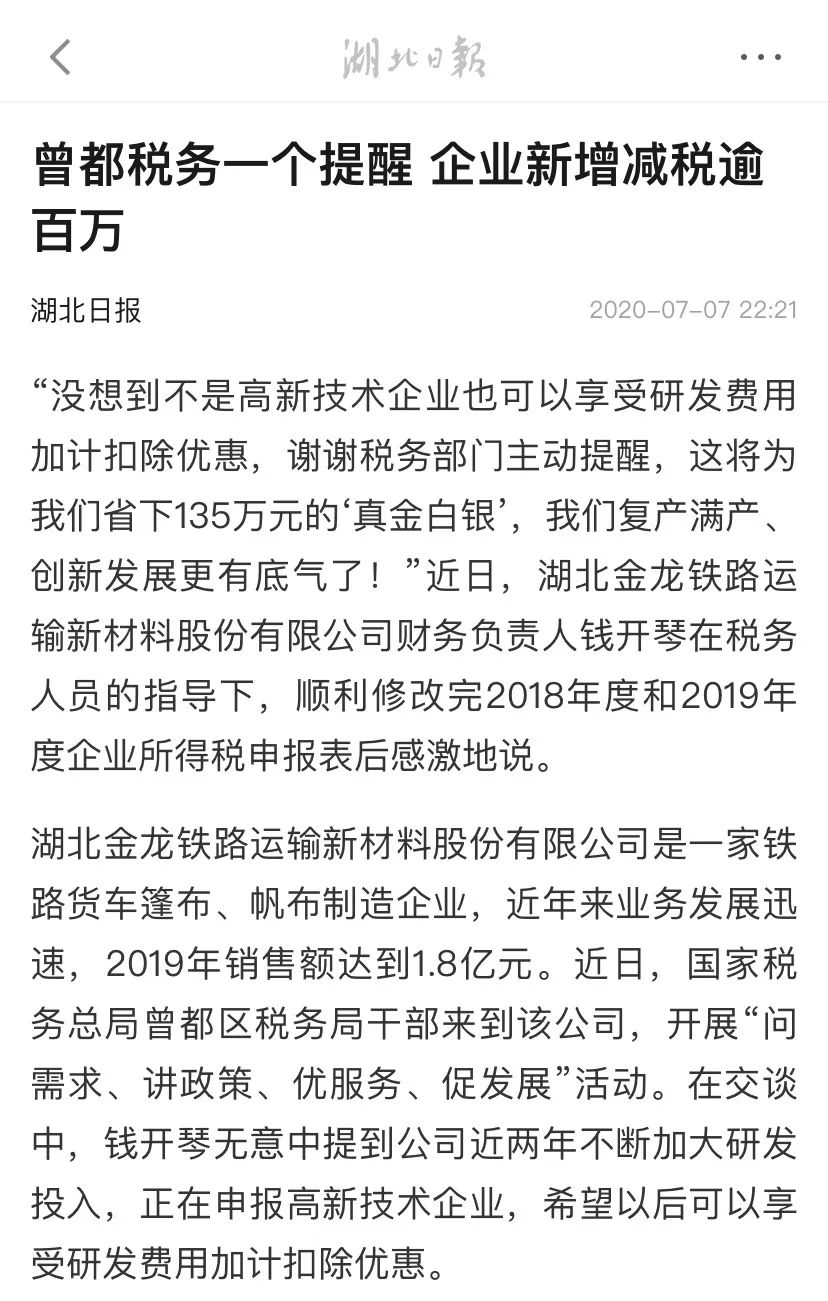 “没想到不是高新技术企业也可以享受研发费用加计扣除优惠,谢谢税务部门主动提醒,这将为我们省下135万元的‘真金白银’,我们复产满产、创新发展更有底气了!”近日,湖北金龙铁路运输新材料股份有限公司财务负责人钱开琴在税务人员的指导下,顺利修改完2018年度和2019年度企业所得税申报表后感激地说。