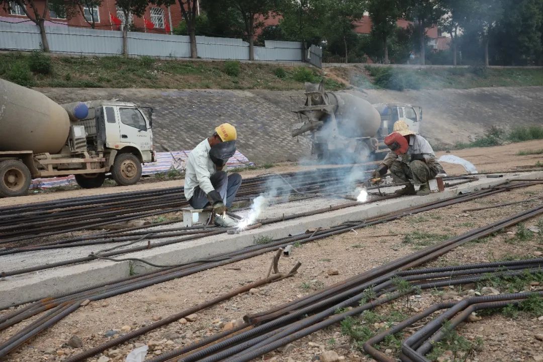 6月24日,笔者来到府河镇沿着府河一路前行,正处建设施工中的府河大桥府河格外引人注目。新桥14孔20米预应力混凝土T梁架设已完成一大半,只剩下几个桥墩等待浇筑盖梁。在一旁的工地上焊花四溅,工人们正忙着焊接钢架。