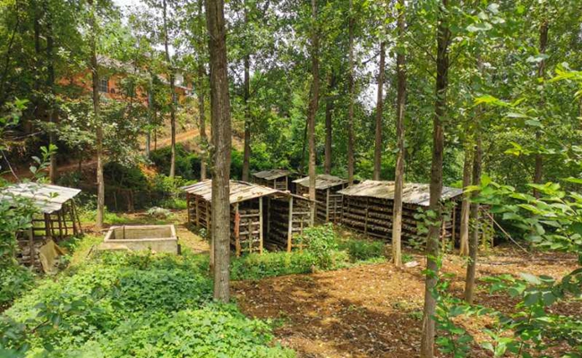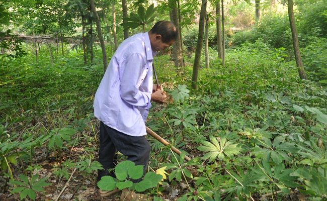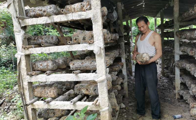 在一处田垄上,村里的贫困户杨自发正在查看他家栽种的药材七叶一枝花,苗圃旁边还有他自建的香菇种植大棚,架子上整齐地摆放着一排排菌棒。杨自发介绍:“那边房屋周围一片高大粗壮的杨树,都是我栽种的。今年我家种了几亩口粮田,院里还养殖了黑猪和10箱子蜜蜂……里里外外都得忙活。”