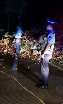 当天晚上20时许,广水市公安局交警大队应山中队巡逻至328省道十里办事处观音村路段处时,发现上百立方米的山体滑坡泥石流将路面封堵,过往车辆很是危险。面对险情,应山中队立刻与路政部门取得联系。与此同时,巡逻民警和辅警冒雨拉警戒绳、设立锥形筒,在确保过往车辆安全的前提下,投入到搬运石块的战斗中。大的石块搬不动几个人合伙推滚,手指磨破了、衣服沾满了泥水全然不顾。