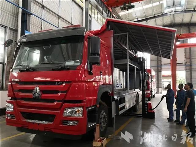 生产线上,一台台张开两翼的开翼式装备运输车引人注目。“这是疫情期间我们研发的新产品,可随车携带灭火器材、救援装备、军用空投箱、电动叉车等多种应急设备,箱体一键式开启,并配备有液压升降尾板,设备取用和收纳方便快捷,能大大提高应急现场处置效率。”廖大勇介绍,该车型一亮相就受到客户青睐,首批8台订单即将交货,每台价值60余万元。