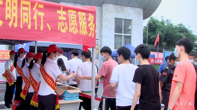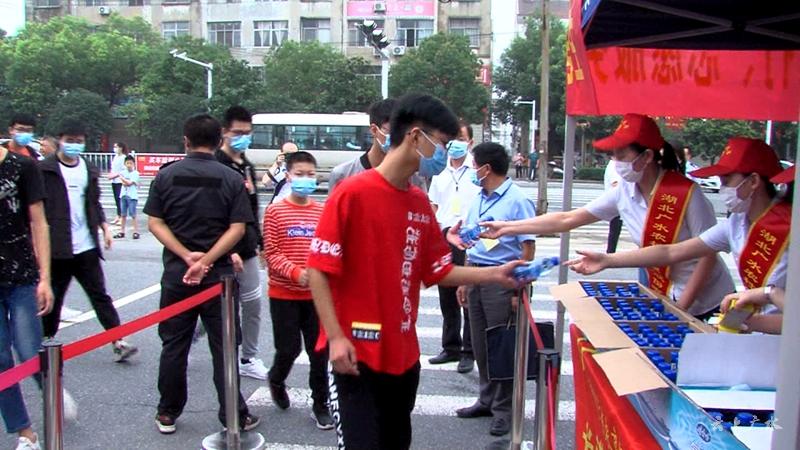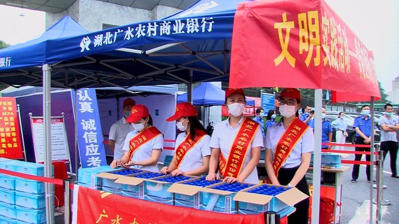 【同期声】农商银行志愿者:“青春文明同行,志愿服务考生”,响应广水市文明办、团市委的号召,广水农商银行今明两天为大家,为广大考生提供了矿泉水、清凉油等防暑物资。我代表农商银行向广大考生祝愿,愿他们顺顺利利,考出优异成绩。