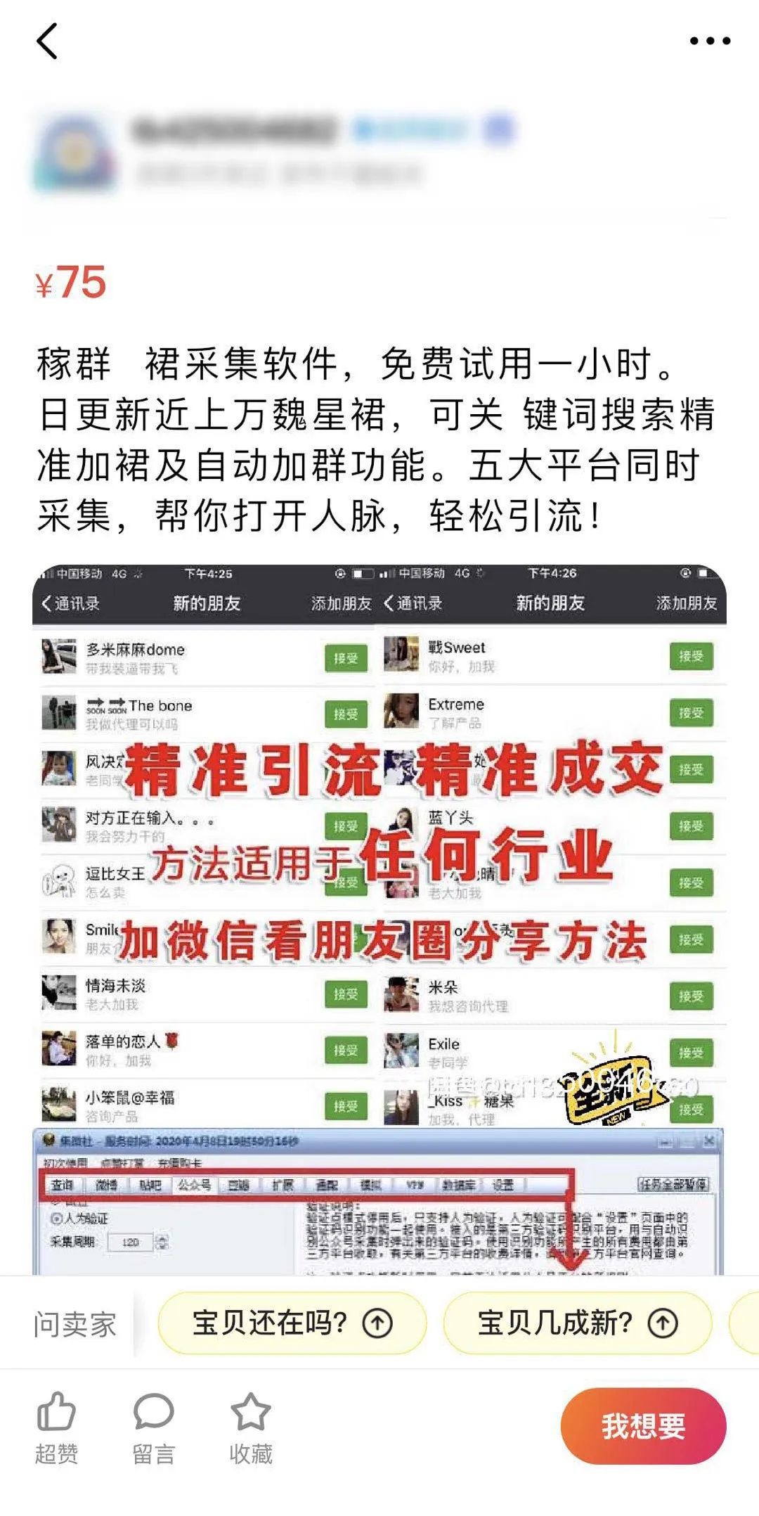 例如,一条题为《每天获取1000个微信群二维码的技术与渠道实战分享》的网文,详细介绍了搜索、使用微信群导航网站和利用采集软件获取微信群二维码的方式。还有一些网文,不仅教授快速批量获取微信群二维码的方式,还对如何在群内潜伏、了解群成员需求等方面进行“教学”。